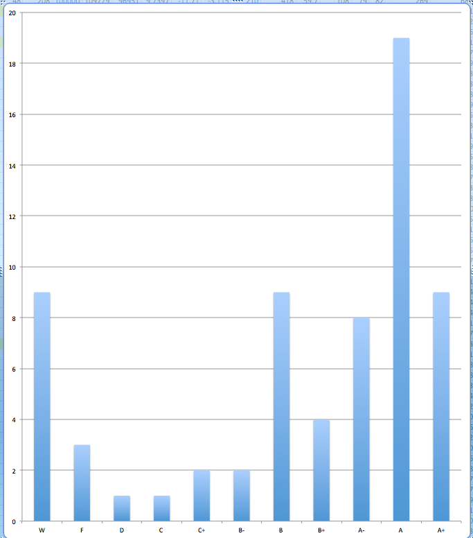 How did the students do? Below is the grade distribution. You can see that 13% of the students who started the course didn’t finish it. Of the 58 that finished the course only 4 (7%) failed or got below 500/1000. Over 48% got an A or A+. Since this is not an easy course, I like to think the grades reflect good learning, good performance, and a level of satisfaction with the educational experience.